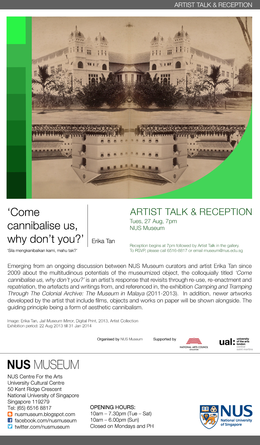 COME CANNIBALISE US, WHY DON’T YOU? – Erika Tan, Current exhibition til Jan 2014 Posted on September 9, 2013 by SPSL NUS Museum, National University of Singapore Exhibition: 22 August 2013 to 31 January 2014 NUS Museum Share this:Share Share on Facebook (Opens in new window) Facebook Share on X (Opens in new window) X Share on LinkedIn (Opens in new window) LinkedIn Share on Tumblr (Opens in new window) Tumblr Share on Reddit (Opens in new window) Reddit Share on Pinterest (Opens in new window) Pinterest Email a link to a friend (Opens in new window) Email Print (Opens in new window) Print Like Loading... Related