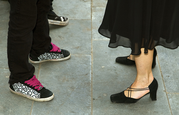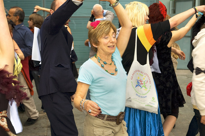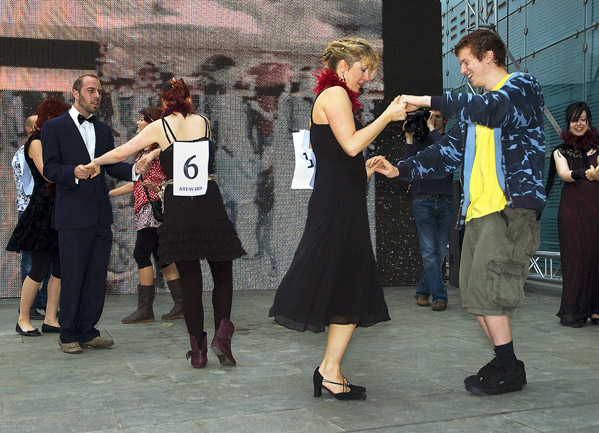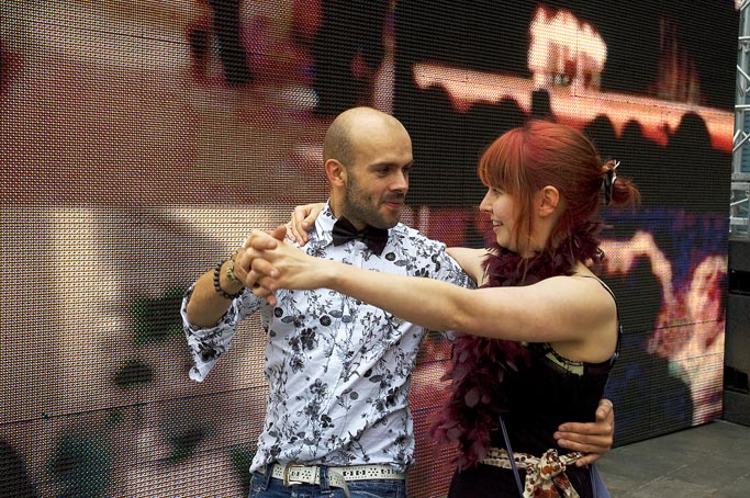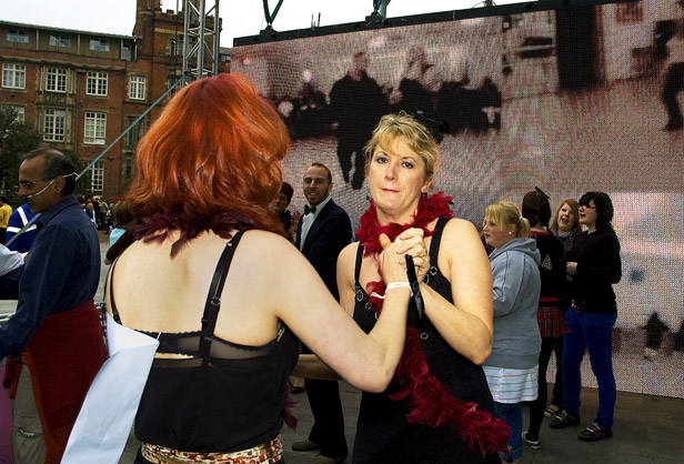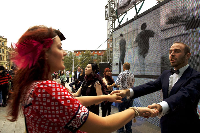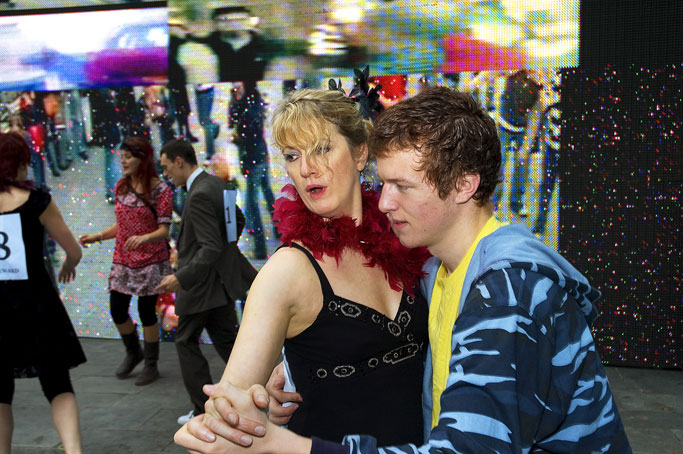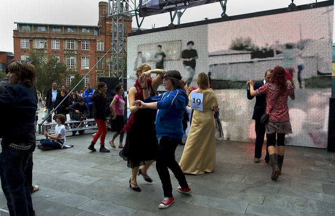Comprising a video/audio work and related live participatory events, DIY Ballroom / Live was launched with the Urban Screens Festival in Manchester and presented through a related conference and screening programme (10 – 14 October 2007). The work then toured to BBC Big Screens in Norwich (_enter, Aurora Festival, 10 November 2007), Leeds (17 November 2007), and Site Gallery, Sheffield (18 March 2008), with live events taking place in Manchester and Sheffield. The video/audio work comprised digital amateur footage of amateur ballroom dancers sourced online, while the live events brought these into relation with analogue, ad hoc gatherings of amateur dancers on the street. The video/audio work then alternated with a live camera feed of the live event. More recently, a version of DIY Ballroom featured in the exhibition, March 2012, at SITE Santa Fe, New Mexico, in 2012.