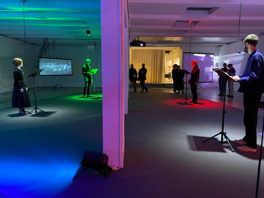REWIND/REPLAY was commissioned by Van Abbemuseum for Rewinding Internationalism: Scenes from the 1990s, Today, a collaborative research exhibition curated by Nick Aikens. First staged at Netwerk Aalst in spring 2022, the earlier iteration featured remote recordings and live rehearsals of REWIND/REPLAY (I): A Script/Score in One Act, Five Rounds and Five Scenes (repeat ad infinitum).