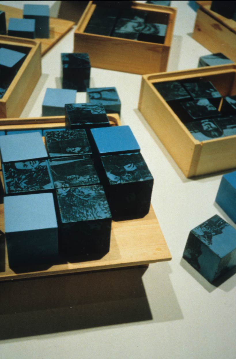 In Unravelling (1994), a handful of childhood photographs from a scant family archive are submitted to scrutiny via dissection, disintegration and dissemination, their multiplication and partial obliteration intimating the shortfalls and compensations of memory/making by such objects; attempts to stay the failures of identities and histories to unify and cohere, submissions to delusory beginnings cast adrift between partial and indifferent narratives. Reproduced and degraded through a copier, image-fragments cling to the surfaces of wooden blocks scattered among custom-made yet ill-fitting boxes, in shades of blue (‘the colour of interior life’[1]). Elevated onto a shallow plinth or false floor, Unravelling evokes child’s play, playing out the fetishisation of unknowable image-objects, magnifying and making intimate details simultaneously distanced by repeated mediation, as well as implicating and frustrating voyeuristic, tactile and narrative desires, by refusing interaction and reconstruction.